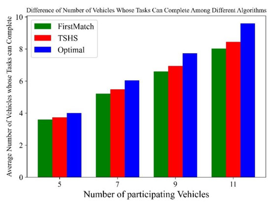 First, we compare the average number of vehicles whose tasks can be completed in cooperative perception using the TSHS, FM and optimal when the cluster scale changes between 5 and 11, as shown in Figure 9. As above, the number of vehicles whose tasks can be completed in each cluster scale is derived by averaging the numbers of all RSDs of the scale, which denotes the mean performance of the algorithms under different cluster loads. The number of each RSD is calculated by averaging the numbers of its 25 simulations, which reduces the influence of randomness on the analysis. In Figure 9, red denotes the TSHS algorithm, green denotes FM and blue denotes the optimal algorithm. The difference between the TSHS and the optimal algorithm does not increase significantly as the scale increases, and the TSHS outperforms FM.
