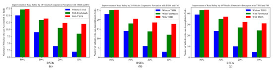 Figure 10 illustrates the average number of vehicles whose tasks can be completed under different RSDs, where green, red and blue indicate cooperative perception using FM, the TSHS and without offloading, respectively. The number decreases linearly with the decrease in the RSD without offloading, and a few vehicles can still complete their tasks by scheduling in the architecture with the TSHS, even under a larger cluster scale and heavy cluster load. At least 55% of vehicles in a cluster can complete their tasks with the TSHS, even when the RSD of a cluster is 10%. Although there is no significant difference between FM and the TSHS when the RSD is large, the TSHS is much better than FM when the RSD is lower because the property of neighbors is considered in TSHS. Therefore, the proposed TSHS can improve the number of vehicles whose tasks can be completed in cooperative perception, especially under heavy cluster loads, which means that road safety is improved by utilizing the resources of connected vehicles in a better way.
