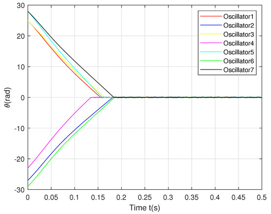 is designed, where is the vibration frequency of oscillators without interaction, and k denotes the coupling strength. The phase of oscillator i is represented by , which is a variable that moves around the limit cycle and increases over time. In addition, is the positive constant in the perturbation intensity . If , then system (1) has a unique global asymptotic stochastic stable trivial solution .
