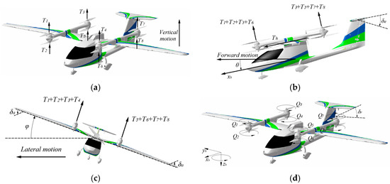 The ET120 has two control modes: hovering and propulsion. The vertical motion is controlled by the total speed of the hovering rotors in the hovering mode and is controlled by the deflection of the elevator in the propulsion mode, as shown in Figure 3a. Longitudinal motion is achieved by attitude control in the hovering mode (through the speed difference of four hovering propellers in front of and behind each other to provide forward and backward acceleration) and is controlled by the propeller and elevator in the fixed-wing mode, as shown in Figure 3b. Lateral motion in the hovering and propulsion modes is determined by the speed difference of the left and right rotors and aileron deflection , respectively, as shown in Figure 3c. The control of the heading motion is the speed difference of two groups of rotors in forward and reverse rotation and rudder deflection , as shown in Figure 3d.