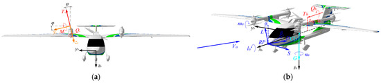 where , , are the coordinates of the k-th rotor in the body frame; , , are the aerodynamic moments; and are the aerodynamic reference point and the CG in the body frame, respectively; and are additional moments caused by the inconsistency of the aerodynamic reference and the CG as well as the thrust line of the propulsion rotor and the CG , which can be expressed as follows: