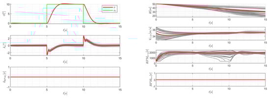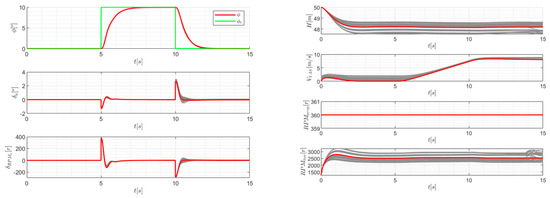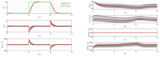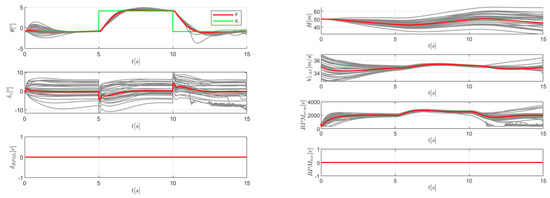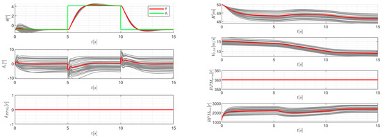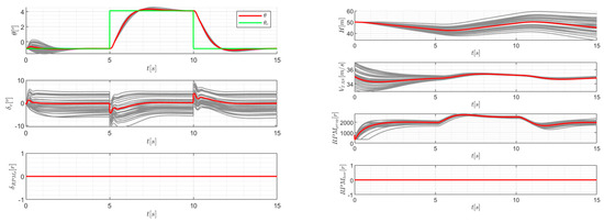 With the perturbations, the tracking performance of the controller in the pitch and roll channels in the typical states of the multi-rotors and the transitional and fixed-wing modes are presented below, where the red lines indicate the nominal state, and grey lines indicate the perturbed state. In Figure 11, Figure 12, Figure 13, Figure 14, Figure 15 and Figure 16, the subscript represents the command, and are the angle of pitch and angle of roll, and are the deflection angle of the elevator and ailerons, respectively, and are the speed difference of the hovering rotors for pitch control and roll control, respectively, is the altitude, is the true airspeed and and are the speed of the propulsion rotors and hovering rotors.