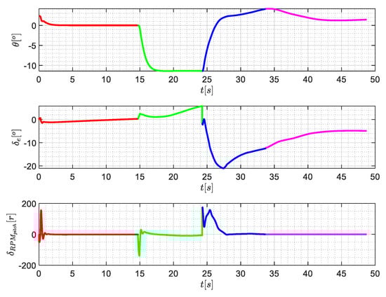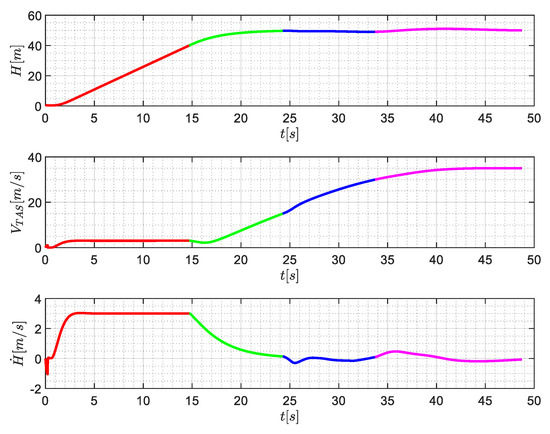 In the presented figures, the red lines indicate the vertical takeoff phase, green indicates low-speed acceleration, blue indicates high-speed acceleration and pink indicates fixed-wing cruising. Firstly, Figure 18 shows the time history of altitude airspeed and the rate of climb, from which the following conclusions can be drawn: