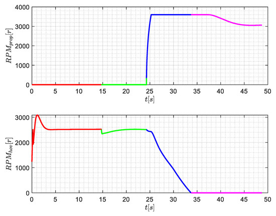 Figure 19, Figure 20 and Figure 21 reveal the control logic of the takeoff and acceleration logic. At the end of the vertical takeoff phase, the pitch angle experiences a significant decrease, which is caused by the acceleration command (given by the speed stick, as is shown in Figure 20). Then, when the airspeed reaches 15 m/s, the pitch angle rises as the hovering rotor speed decreases. This phenomenon occurs due to the switch of the altitude control logic, and when the flight enters high-speed acceleration, the altitude is controlled by the pitch angle instead of the hovering rotor speed. The propulsion rotor speed increases to control the forward speed, as in this phase, the pitch angle is occupied for altitude control.