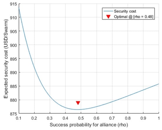 The total cost shall be minimized by the given , which is the optimal value of the alliance accountability (i.e., the acceptance rate). The illustration in Figure 4 visualizes an optimal result by using the SABGG-based drone swarm network with the given conditions. According to the initial setup in Table 2, the minimal cost for executing one smart drone swarm operation is USD 876 when the drone swarm keeps a 48 percent acceptance rate (i.e., ) for the alliance request to other drones. The moment of alliance request shall be one step prior to the time when an attacker catches more than half of the total drones. This practice is targeted only for visualizing cost optimization, not for simulating smart drone management. It is noted that the visualization (see Figure 4) is aimed for showing how the SABGG closed forms (e.g., (17) and (78)) could be applied for analyzing the operation costs of a secured smart drone swarm.
