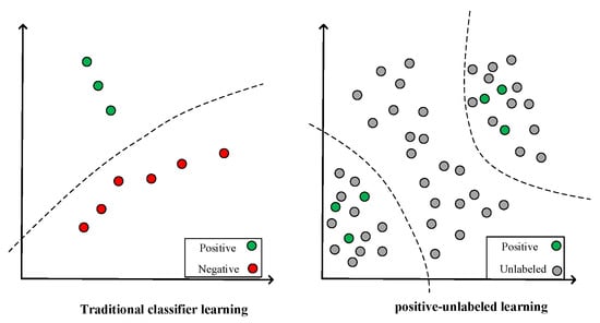 The difference between traditional classifier learning and positive-unlabeled learning is shown in Figure 1. The training data used in traditional binary classification is composed of two fully labeled sets, which are positive samples and negative samples. However, the available training data is usually a set of incomplete positive samples and a set of unlabeled samples with positives and negatives. The real data set is generally a non-traditional training set that is not completely labeled. The positive-unlabeled learning problem is how to learn an accurate classifier given a non-traditional training set.