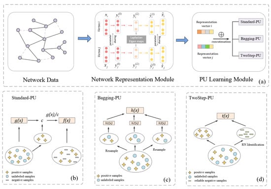 We demonstrate the architecture of our proposed framework which has two modules: a network representation module and a positive-unlabeled learning module, shown in Figure 2. We first input the network data into the network representation module (Figure 2a) to obtain the representation vector for each node. Then, we concatenate representation vectors of node pairs and feed them into different classifiers to make binary classification (i.e., to predict whether the link between a node pair exist or not). For alleviating data imbalance and boosting the prediction precision, we present a positive-unlabeled learning module which adopts three types of positive-unlabeled learning strategies (Figure 2b–d) to improve the model and compare their prediction performances.