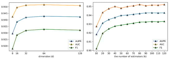 Parameter Sensitivity of our method. (Left) The dimension of representation vector d, (Right) the number of estimators in the Random Forest classifier.