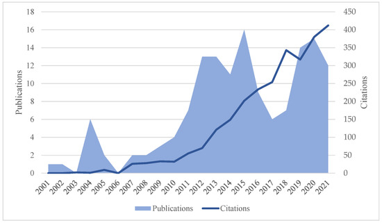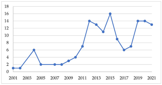The number of publications per year is shown in Figure 2. Of the 145 papers selected, most have been published in the last decade. In the last 10 years, the trend increased until 2015 (in this last year, there are 16 papers), experiencing a sharp decline in the following three years to start growing from 2019. In the last three years, 41 papers with impact have been published (until October 2021).