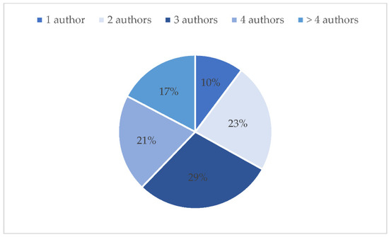 Only 8.97% of the papers were signed by a single author, 20% were signed by two authors, three authors signed 25.52% of the papers, 17.93% were signed by four authors, and the rest were signed by five or more researchers (Figure 3).