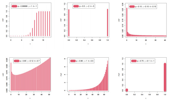 In Figure 1 and Figure 2, some PMF and HRF plots of the DEGW model are sketched under some selected parameter values. Based on Figure 1, it can be seen that the PMF of the DEGW can be “asymmetric and left skewed”, “asymmetric and right-skewed”, “symmetric”, “uniform”, or “right-skewed with heavy tail”, among other useful PMF shapes. Moreover, it can be used as a probability tool to discuss zero-inflated data. According to Figure 2, we can conclude that the HRF of the DEGW can be “increasing-constant”, “constant”, “monotonically decreasing “, “bathtub or decreasing-constant-increasing “, “monotonically increasing”, or “J-shaped”.