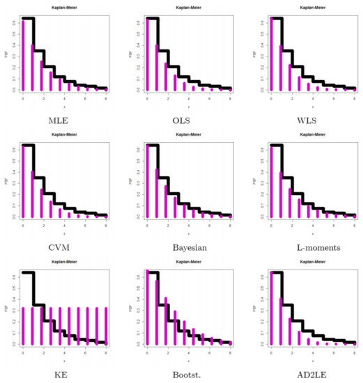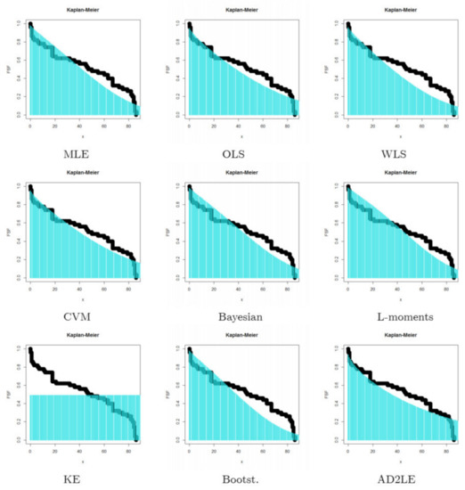 In this section, we are concerned with the different estimation methods, including classical methods and Bayesian methods. The classical methods are many and varied, some of which depend on the theory of maximization, and some of which depend on the theory of minimization. In any case, the classical methods on the whole differ from Bayes’ method in their origin and methodology of estimation, as will be explained in detail in theory and practice. The two subsections of this section cover Bayesian and non-Bayesian estimation techniques. Eight non-Bayesian estimation techniques, including the MLE, CVME, OLSE, WLSE, L-mom., KE, Bootst, and AD2LE methods, are taken into consideration in the first subsection. Then, the Bayesian estimation approach under the well-known squared error loss function (SELF) is taken into consideration in the second subsection.