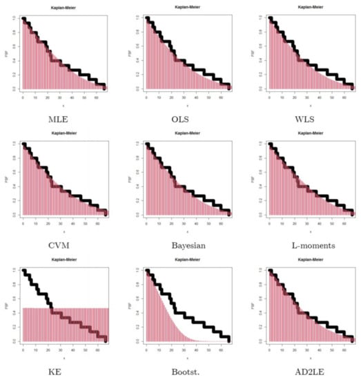 For estimating each parameter, the KEs are obtained by comparing and and selecting the maximum. However, for , we minimize the whole function For more detail about the KE approach, see the work of Aguilar et al. [21].
