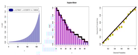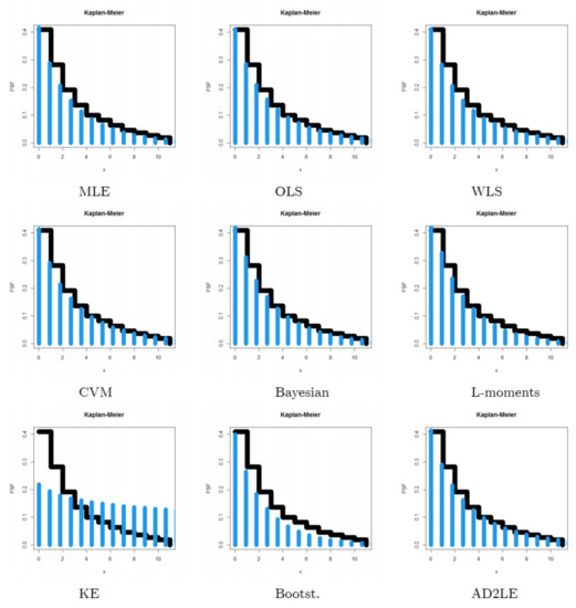 - In modeling the asymmetric failure time count data (the data of 50 devices), it can be seen that the Bayesian method is the best method, with K–S = 0.14712 and P.V = 0.22927, followed by the MLE method, with K–S = 0.163038 and P.V = 0.15266. However, for this dataset, the discrete exponential generalized G family provides the best fit under the Weibull baseline, with = 233.467, AICR = 472.933, CAICR = 473.455, K–S = 0.16304, and P.V = 0.15266.