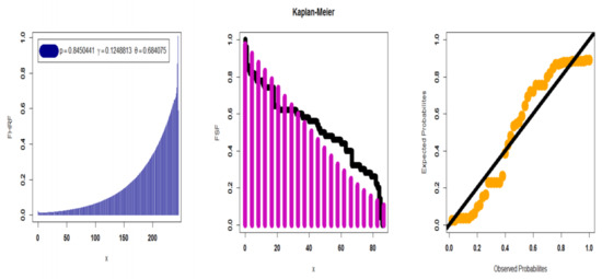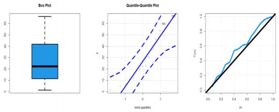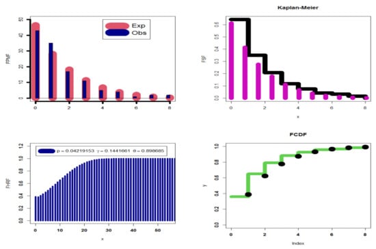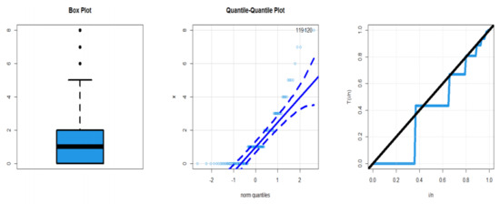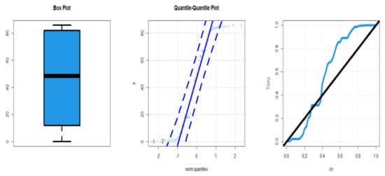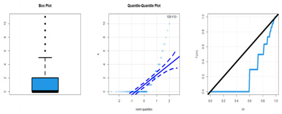In this section, we compare the DEGW distributions’ fits to those of other rival models, including the DGIW, DIW, DBXII, DIR, DR, NB, DPa, and Poisson model. Table 19 displays the MLEs and St.Ers. The goodness-of-fit statistics are shown in Table 20. Based on Table 20, the DEGW provides the best fits against all competitive models, with , AICR = 407.912, CAICR = 408.119, = 2.07337, and P.V0.35463. Figure 13 gives the boxplot, Q-Q plot, and TTT plot. Figure 14 gives the FPMF, FSF, FHRF, and FCDF plots for corn borer larvae data. Based on Table 19, we have 1.44422, 2.811083, 1.329544, 4.446335, and Disp-Ix 1.946437.