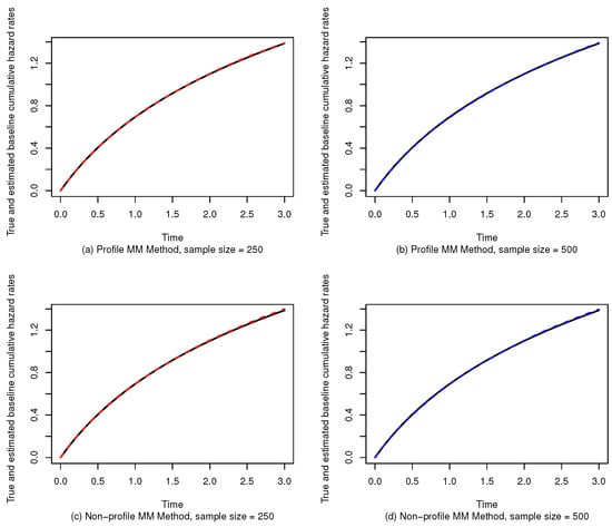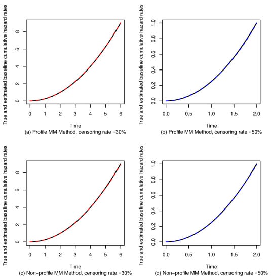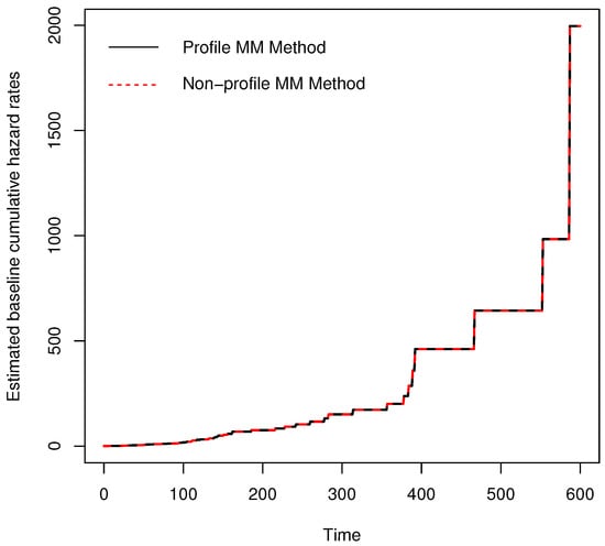 where and denotes the quantile of ’s and separately. Table 9 and Table 10 present the estimation result of two MM algorithms, where the standard estimated error (SE) is defined by Equation (13) and the 95% confidence interval (CI1) is defined by Equation (12). Moreover, the 95% confidence interval (CI2) is defined by Equation (14). In addition, the estimated cumulative hazard function are plotted in Figure 3.