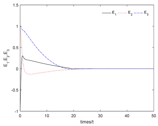 Figure 5 shows that the sum system is asymptotically stable. Figure 6 shows the states of the master subsystem and the slave subsystem, respectively. It is easy to see that the state vectors of the slave subsystem have the same amplitude but opposite signs to those of the master subsystem, which implies that the partial anti-synchronization problem of the 4D financial hyper-chaotic system is realized. Figure 7 shows that tends to as . Figure 8 shows the state of control signal .