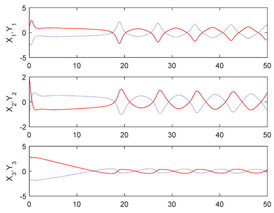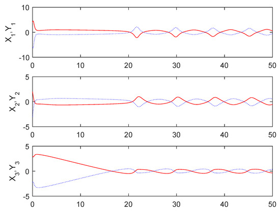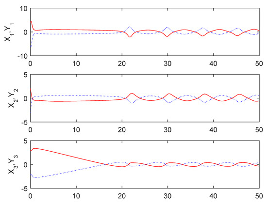 The initial conditions of the master subsystem given in Equation (18) and the slave subsystem given in Equation (20) are chosen as , respectively, and , and . The controller given in Equation (24) is chosen here.