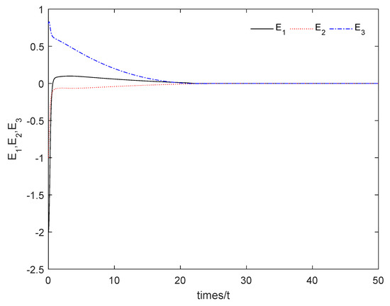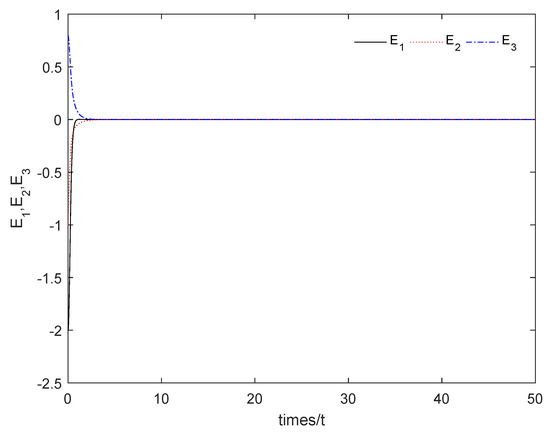 The initial conditions of the master subsystem given in Equation (18) and the slave subsystem given in Equation (20) are chosen as , respectively, and . Without loss of generality, the controller given in Equation (24) is taken as an example.