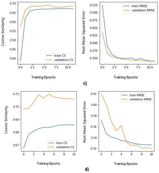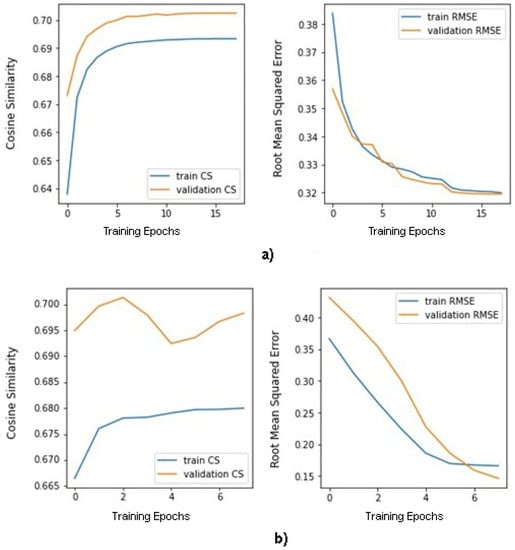 In addition, for better DL model evaluation and comparisons with other studies, cosine similarity (CS) was used. CS is a measure of similarity between two paired sets of numbers. This metric is interesting for image recommendation systems based on comparisons of two paired images []. The results of such comparisons are given in the form of values between –1 and 1, whereby values closer to 1 are obtained for the most similar strings. This metric is interesting for use in regression models for training because, together with the loss function, it can be used to estimate the moment when the model starts to overfit, similar to the accuracy metric for classification.