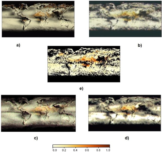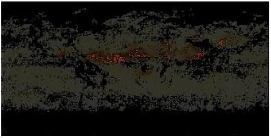 As a practical example of an application of the ConvLSTM models, a forecast of global AOT for the next eight days was performed. The predicted image was processed and filtered in order to locate spots with the highest aerosol concentrations on a global map; see Figure 5.
