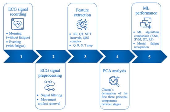In this section, we describe the proposed data analysis and classification processes that are essential for mental fatigue recognition. The whole process flow consists of five main parts: ECG signal recording, ECG signal preprocessing, feature extraction, PCA analysis, and ML performance (see Figure 1). The experiment was designed with ECG signal registration twice a day (in the morning and in the evening). HRV analysis or whole ECG signal classification techniques failed on the mental fatigue recognition task, so we proposed the extraction of ECG signal features only when applying classification algorithms, such as KNN, DT, RF, etc. Before implementation of a machine learning technique, PCA analysis was applied to make sure that there were significant differences between ECG signal features in separate states. This research was conducted with the approval of the Kaunas Regional Research Ethics Committee of our institution under the project name, “Various directionalities on physical exercise effects that are based on differential learning methodology, and impact on heart and cardiovascular system” (biomedical ethics permission number BE-2–38, Lithuania).