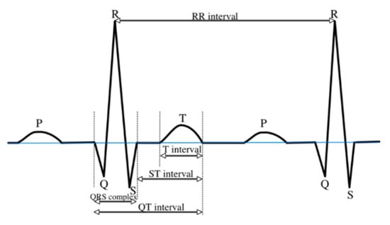 In this study, various ECG signal features were analyzed and classified. The protocol consisted of two 60 sec recordings of each participant. These recordings enabled the detection of differences in ECG signal parameters, which were estimated at the beginning of the day and in the evening. V5 lead was selected in this research (see an example in Figure 2), with each parameter representing a separate component of heart activity (see Table 2).