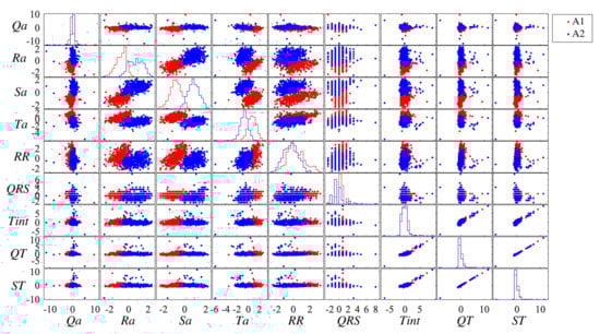 As mentioned in the previous section, two states were analyzed in this study (A1 in the morning and A2 in the evening). All parameter data were normalized by subtracting means and dividing by the standard deviation. This type of data normalization is needed to eliminate differences in individual heart rate characteristics of each person. For example, some participants may have higher (or lower) ECG signal amplitude values compared to others in both states (in the morning and in the evening), which may affect classification results, indicating fatigued state in both datasets. Furthermore, normalization increases data integrity without distorting differences in the ranges of values. The distribution and scatter plots are shown in Figure 3. Pearson correlation coefficients are presented in Figure 4 (Y represents the state: a value of 1 corresponds to the fatigued condition or state (A2), and a value of 0 corresponds to the fatigue-free condition of state (A1)). Comparing data from different states, clear differences could be noticed. For example, histograms of the Sa parameter look similar, but A2 data are shifted, with higher values compared to state A1 values (see Figure 3). Furthermore, some ECG signal parameter values overlap. For example, there is no significant difference between states A1 and A2 in terms of RR interval values. Therefore, typical HRV analysis fails in mental fatigue detection, with low classification accuracies.