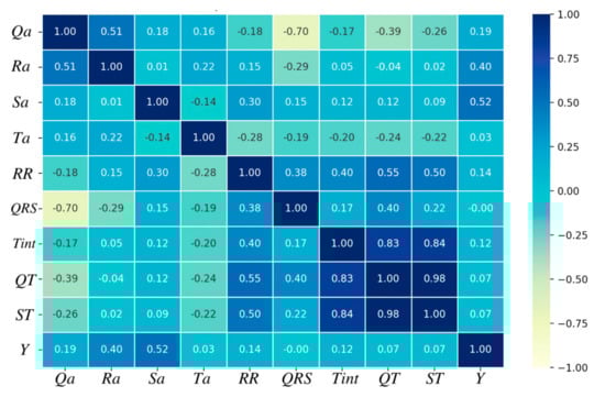 Figure 3 shows linear dependences between several parameters (for example, between parameters QT and ST). Similar results are shown in Figure 4 (for example, the Pearson correlation coefficient for ST and QT reaches 0.98). Additionally, a strong dependence (Pearson correlation coefficient > 0.8) is evident between Tint and QT or ST. Although some parameters may be eliminated in the classification step, it is not clear which parameters have a greater impact on classification accuracy. In the initial stage of the classification process, all ECG signal features were included (all 9 ECG parameters).