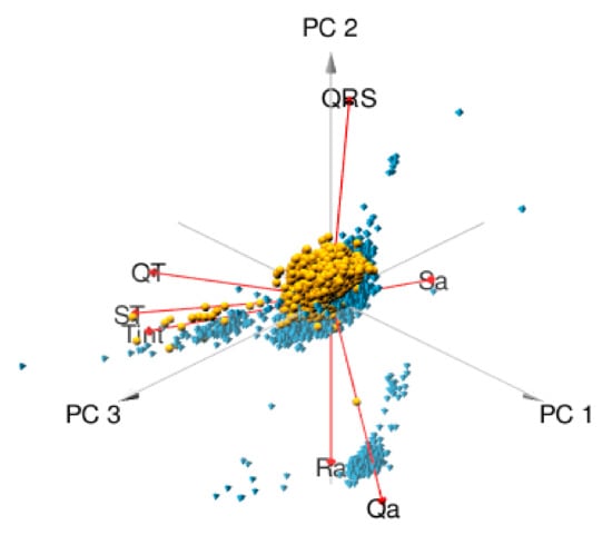 Considering all collected data, the main parameters of Tint, QT, and ST, which reflect the first principal component, have an interval, whereas the second principal component mainly covers amplitude parameters, i.e., Qa and Ra. These results are consequential, as during casual daytime activity, the amplitude of the heart rate changes less than the intervals between two waves. A summary of the PCA results for the whole dataset is presented in Table 4. A 3D plot of the obtained results was drawn using RStudio tools (see Figure 5). A significant difference was observed between the two groups: yellow dots represent the morning state, and e blue pyramids represent the evening state. The change in parameters is more noticeable in the evening subset. Moreover, the evening data can be further grouped into several clusters, whereas the morning data are mainly concentrated in the center.