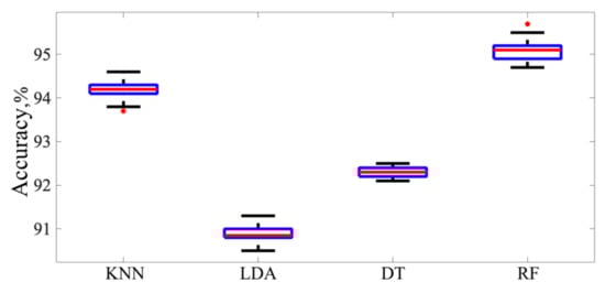 At the beginning of this research, multiple ML algorithms were compared (see Table 6 and Figure 7) using all 9 ECG parameters. In this case, the input dataset was split into training with validation (70%) and testing (30%) subsets. Analysis of data shows that a lower allocation of data to the testing subset slightly reduces the overall accuracy of the KNN, DT, and RF algorithms. For example, reducing the testing dataset to 20% of the total data for the RF model resulted in a reduction in accuracy of 2%. This may also result in lower quality and feasibility of selected classifiers. To ensure that the model did not overfit the training data, 10-fold cross validation was applied for all ML methods. In Figure 7 shows the validation accuracy results following 100 calculations. Table 6 shows averaged, F1, and MCC values for a better comparison of the analyzed ML algorithms.