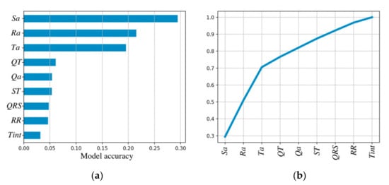 The importance of ECG parameters for classification of states A1 and A2: (a) ECG parameters and FR accuracy; (b) cumulative accuracy curve for the RF model.