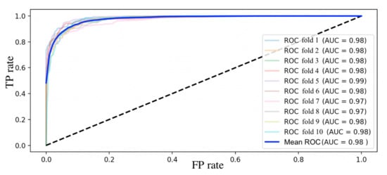 K-times cross validation was used in the RF model training process. The training dataset was split into two subsets: the training set and the testing set. In this case, the same steps were repeated 10 times, and averaged results were estimated. Receiver operating characteristic curves (ROCs) are commonly used to visually represent of k-fold cross validation. These curves help to plot and illustrate the true-positive (TP, correctly classified values of state A2 presented on the y-axis) and false-positive (FP, misclassified A1 state values presented on the x-axis) rates. The 10-fold cross validation and averaged curve for states A1 and A2 are illustrated in Figure 9. In this figure, the area under the ROC curve (AUC) provides an accumulated measure of performance across all possible classification thresholds. In this research, the AUC indicated the probability that the model ranks a random value from state A2 more highly than a random value from state A1. Analysis of multiple scenarios with various k values shows that in most cases, a lower number of k-folds may negatively affect recall or precision values. However, the AUC value remains similar, and further investigation is needed to determine the number of k-folds in the cross-validation process. Due to small changes in the results, we decided not to present all possible combinations and instead use only 10-fold cross validation as an example.