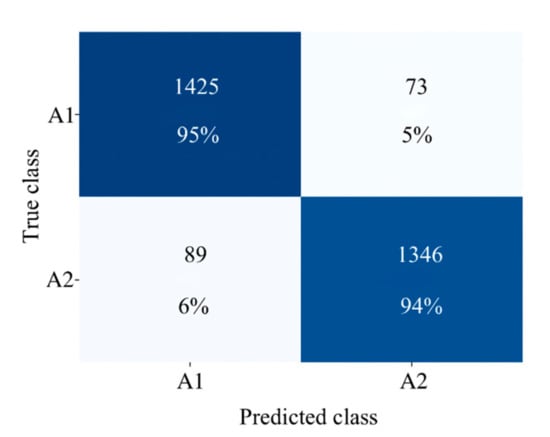 Based on cross-validation results (see Figure 9), and accuracy of 98% can be expected for A1 and A2 state classification. The next step is to test the final RF model using a separate dataset (30% of all input data). The testing accuracy of the constructed RF model is equal to 94.5%, which is lower than expected (validation accuracy, 98%). However, this model can sufficiently classify and correctly assign values to states A1 and A2. True-positive (state A2) and false-positive (state A1) values are predicted with similar accuracy (95% and 94%, respectively) (Figure 10).