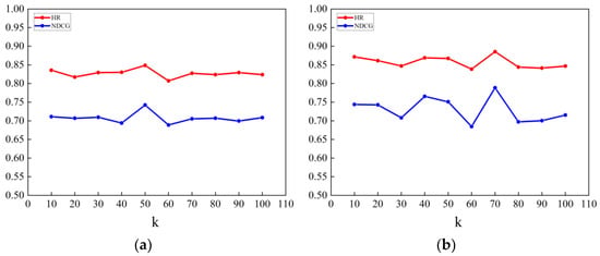 The NeuMF-CAA method needs to first determine in the POI clustering based on the k-means algorithm. We refer to the calculated by the Elbow Algorithm [37]. As shown in Figure 2, the Foursquare dataset had better clustering performance when was approximately 40–60; however, the Weibo dataset had better clustering performance when was approximately 40–70. This “elbow” cannot always be unambiguously identified, making this method very subjective and unreliable. Therefore, we referred to the relevant literature [12] for the selection of and performed a series of experiments. Figure 3 shows the changes in HR and NDCG of NeuMF-CAA with when the POI recommendation list is 10. As shown in Figure 3, for the Foursquare dataset, the best recommendation performance was achieved when ; for the Weibo dataset, the best recommendation performance was achieved when . The values selected by the experiment are within the range of determined by the Elbow Algorithm. Consequently, and are fixed in Foursquare dataset and Weibo dataset, respectively.