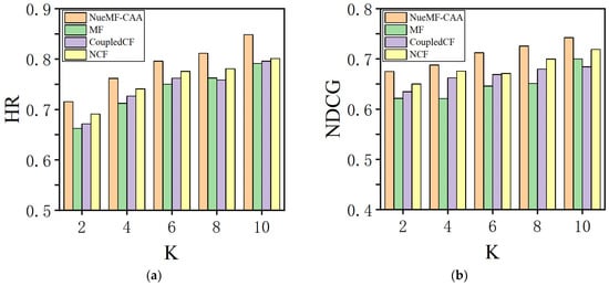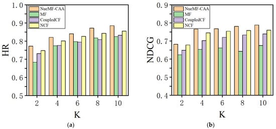 Figure 6 shows the results of the comparison experiment based on the Weibo dataset. The performance of the POI recommendation method proposed in this paper was shown to be significantly superior than other comparison algorithms on the evaluation metrics. Figure 6a shows that when K = 10, the HR of the NeuMF-CAA model is 0.8853, which is about 3.53% higher than that of the better-performing NCF. Compared with traditional MF and CoupledCF, it is improved by 7.31% and 6.34%, respectively. Figure 6b shows that when K = 10, the NDCG of the NeuMF-CAA model is 0.7884, and the NDCG of the NeuMF-CAA model is improved by approximately 3.74~16.8% compared with other baseline methods.