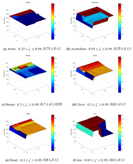 Reasoning by Section 3.2, the expressions of these two threshold functions lead to the following results: and under the above two conditions, where and . Based on Equations (9) and (10), it is easily to obtain and by confirming the parameter and analyzing the distribution information of the original data. In summary, we can change these two threshold parameters to , . The rough set model below, which is including parameters and is defined as fuzzy neighborhood ζ-decision-theoretic rough set (FNζDTRS):