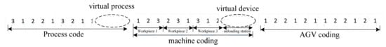 The genetic algorithm involves three segments of chromosome coding: process coding, machine coding, and AGV coding. The process code describes the sequence of the production process, and its gene length is . The machine code indicates the processing machine where the process of each workpiece is located, and the length of the gene string is . The AGV code corresponds to the task code, and the length of the gene string is the length of the AGV task code string. For example, in the code shown in Figure 1, process codes are sorted from left to right, the first number 3 represents the first process of workpiece No. 3, and the fourth number 2 represents the workpiece No. 2. The fifth number 3 of the machine code indicates that the second process of the workpiece No. 2 is processed by machine No. 3, and the tenth number 4 indicates that the unloading task is virtualized by the virtual equipment, that is, the unloading station. The fourth number of the AGV code is 1. The fourth task representing the process code, that is, the second process of workpiece No. 2, is transported by the AGV numbered 1. If the handling process is assigned to the corresponding AGV code, a sequence with process handling will be generated: ,,, The corresponding handling time series is [1, 1, 3].
