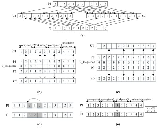 Chromosome crossover operation and mutation operation. (a) POX crossover operation of process code; (b) MPX interleaving operation of machine code; (c) MPX crossover operation of AGV code; (d) Mutation operation of process code; (e) Mutation operation of machine code.