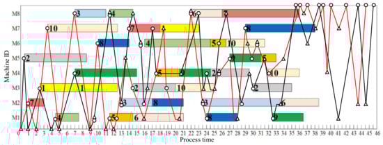 The fitness function solved by the genetic algorithm for scheduling of multi-AGV flexible manufacturing units considering charging is , the maximum completion time. The smaller the is, the better is the individual. The decoding operation of chromosomes is actually the process of converting chromosomes into feasible solutions for scheduling, which can obtain the process profile, the machine used in the process and its processing time, the AGV trolley transported, and its handling time, etc.