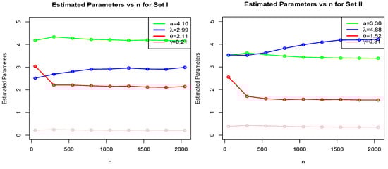 The numerical and graphical results of MCSS are presented in Table 1 and Figure 4, Figure 5 and Figure 6. According to expectations, under the theory of first-order asymptotics, the MSEs and ABs decreased when n increased for Scenarios I and II. In this manner, the MLEs of NGE3ED parameters performed well.