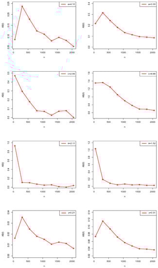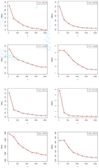 The number of MCSS replications was N = 10,000 with sample sizes 50, 300, 550, 800, 1050, 1300, 1550, 1800, 2050. We used the R-function for maximizing the LLF of a probabilistic model. We examined the performance of MLEs for model “NGE3E” (a specific case of family) by computing the (i) average estimates (AEs), (ii) mean square errors (MSEs), and (iii) absolute biases (ABs).