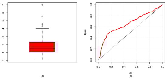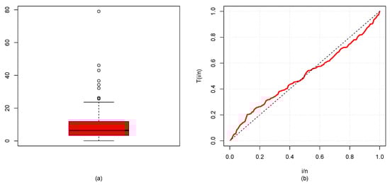 The descriptive statistics (DSs) for the GP and BC datasets are presented in Table 2, and their box plots are shown in Figure 7a and Figure 8a, which demonstrate that distribution was skewed to the right. TTT plot of GP data displayed in Figure 7b reveal that the FRF was concave, suggesting an increasing failure rate shape, while the TTT plot of BC data in Figure 8b moved from concave to convex, giving an indication of UDBT-shaped failure rate. Accordingly, the NGE3E model could be suitable for fitting these datasets.