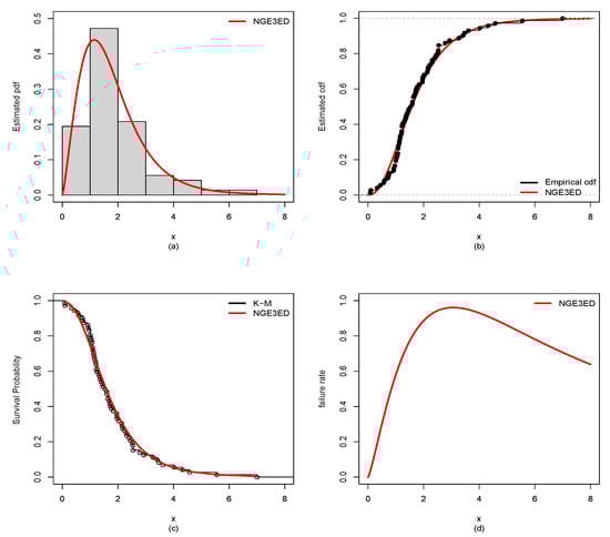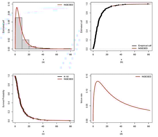 MLEs with standard errors (SEs) for NGE3ED and CMs (EWE, WE, EEW, BEF, OGEW, OGEFr, EKE, KwW and WL) fitted to the guinea-pig and bladder-cancer datasets are listed in Table 3 and Table 4. The values of GFMs in Table 5 and Table 6 indicate that the NGE3E model gave small values of -L, AIC, CAIC, BIC, KS, CM, and AD, and a higher corresponding p-value. Hence, it showed a relatively better data fit than that of the CMs. Further, plots in Figure 9 and Figure 10 also support this conclusion.
