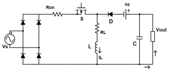 Equations (23) and (24) show the feed-forward control for the buck-boost PFC to obtain duty cycle values. Referring to the performance competencies, a detailed topology of the buck-boost converter is shown in Figure 4 to improve the performance in obtaining duty cycle values. Switching resistance Ron, inductor resistance RL, diode voltage drops Vd, and the ripple at output voltage vo_ripple are considered in the calculations, and their results are observed. Therefore, referring to the most precise model in Figure 4, the duty cycle calculation is given by Equation (25) for CCM and Equation (26) for DCM: