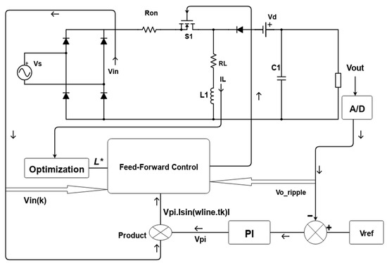 The feed-forward control for N parallel-connected buck-boost PFCs, shown in Figure 6, consists of source voltage vin, switching period Ts, inductance L, and output voltage vo. In the feedback loop, the inductor current is also added in the form of Is(k), which is the sum of the inductor currents of N converters connected in parallel. Both assumptions remain the same, i.e., parallel-connected PFCs are functioning in continuous conduction mode (CCM) or discontinuous conduction mode (DCM), and their switching frequency is much higher than the line frequency, so the input voltage during one cycle is taken to be constant. The control considered here is feed-forward, while the current behavior of the inductor is shown by the present switching cycle [32,33].