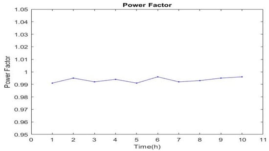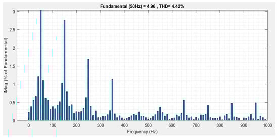 The total harmonic distortion graph of whole system is given in Figure 15, which offers the minimum value of THD for the system. In our specific case, the distortion power factor is the focus. A system with switching power converters refers to a non-linear system, so the power factor correction performed in this case will result in an improvement in the distortion factor. The power factor is obtained by the product of both the displacement and distortion factor, i.e.,