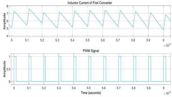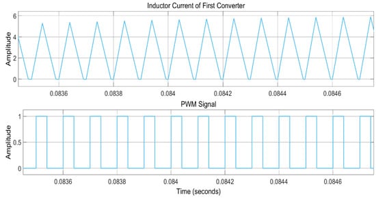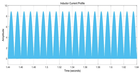 For the resistive load, the cosine of the angle between voltage and current is zero, while for the value of THD of 4.42, the power factor corresponds to an almost unity power factor. This low-value THD is the base for the high power factor of the considered power system. The inductor currents for each mode of operations, i.e., CCM and DCM, are illustrated in Figure 16 and Figure 17, respectively. From these figures, it can be seen that, in the case of CCM, the inductor current never goes to zero, i.e., it is not fully discharged during a commutation cycle, whereas for DCM, the inductor current goes to zero during one switching cycle. For every new cycle, the inductor current starts from zero, which means that the inductor is discharged fully during a whole commutation cycle.