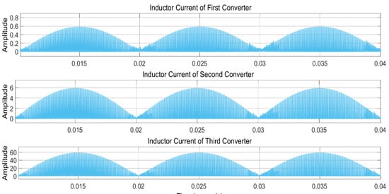 The proposed scheme was verified in MATLAB/Simulink with power system parameters shown in Table 1. As an example, three buck-boost converters were connected in parallel, which initially took the values of the inductors as being identical to each other i.e., L1 = L2 = L3 = 0.5 mH; then, simulations were undertaken for different values of inductors i.e., L1 = 5mH, L2 = 0.5 mH, and L3 = 0.05 mH. The input voltage was taken as 300 V, switching frequency was maintained at 10 kHz, and line frequency was 50 Hz. The simulations were performed for variant loads to validate our proposed scheme. The results plainly indicate that harmonics in the current waveforms are reduced, which lowers the THD value. The power factor was also improved. It also indicates that when inductors are identical, then load current is correspondingly shared between the converters. In contrast, when inductors have different values, then load current will be shared according to their capabilities. All the results are shown below in Figure 8, Figure 9, Figure 10, Figure 11, Figure 12, Figure 13, Figure 14, Figure 15, Figure 16, Figure 17, Figure 18, Figure 19,Figure 20 and Figure 21.