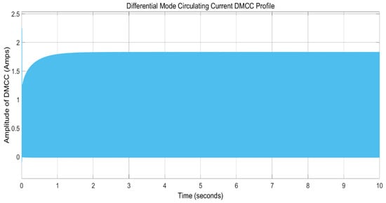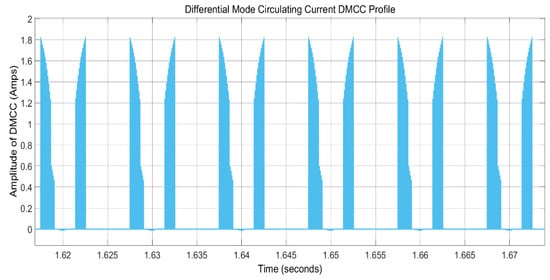 This proposed control scheme can also play a vital role in eliminating the circulating currents, i.e., DMCCs, as a parallel-connected converter scheme is under consideration. To show the robustness of the converter, a comparative case study was performed for this considered system in which the average inductor current mode controller (AICMC) was used first for observing DMCC behavior. The magnified waveform profile of these DMCCs for AICMC is shown in Figure 18. Differential mode circulating currents for AICMC are shown in Figure 19, which means that currents still exist between two converters, and, similar to each parallel-connected converter, these can be dangerous for MOSFETS. Therefore, by applying the proposed controller to the system, the DMCCs for the first two connected buck-boost converters are shown in Figure 20, which shows that circulating currents in terms of the parallel connection of the converters are eliminated efficiently.